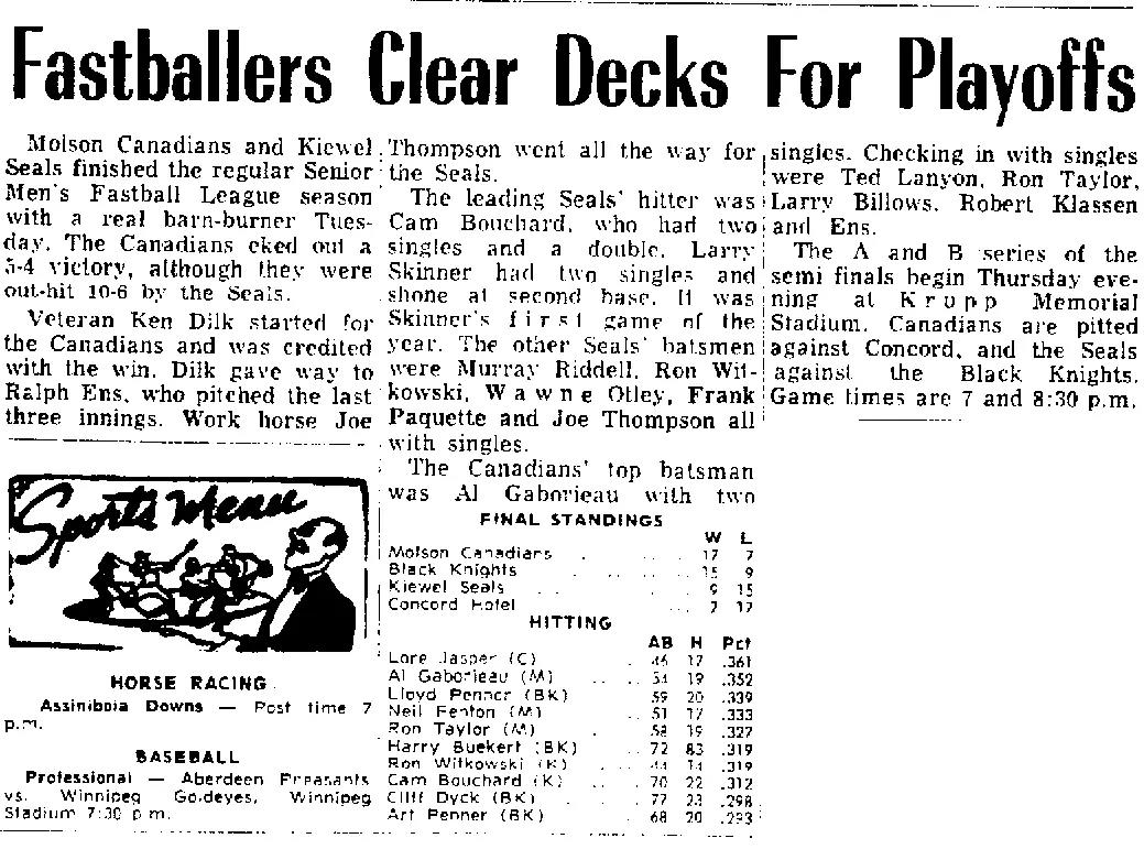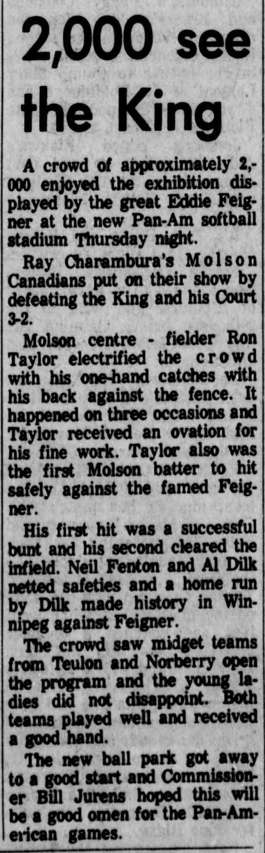 Molson Canadians have to be considered Manitoba's Cinderella softball team of all time. First of all, the team didn't win its regional playoff in 1967 losing to Thunder Bay in a 21-inning marathon in the first game of the competition and again in the final. Then destiny tapped the Canadians on their shoulders. Thunder Bay didn't have the resources to go to the Canadian Championship in Saskatoon so Canadians agreed to fill in. Not all their players could make the trip on short notice leaving the team with three pitchers and just seven regulars. This meant manager Ray Charambura had to play the outfield until reinforcements Buzz Lamond and Lorne Benson were flown in for the weekend. Somehow Canadians sucked it up and beat Quebec in the final. It's the only senior men's fast pitch championship that Manitoba has ever won. In 1968, Molson with six pickup players from outside Manitoba represented Canada in the World Championship in Oklahoma City. The team finished second to the USA. The Manitoba Softball Hall of Fame and Museum Inc. will recognize the players and management of the 1967 Molson Canadians and the Manitobans on the 1968 team. They are captain Ted Lanyon, Don Scheldwitz, Neil Fenton, Ken Dilk, John Kalinowski, Jim Macey, Ron Coleman, George Richardson, Bob Klassen, Ted Waytowich, Al Glover, Lorne Benson, Buzz Lamond, Jimmy Johnson, Ron Taylor, Al Dilk and playing manager Charambura. Steve Brezden was the coach with Ron Taylor Sr. serving as team president and Bill McLeod as business manager.