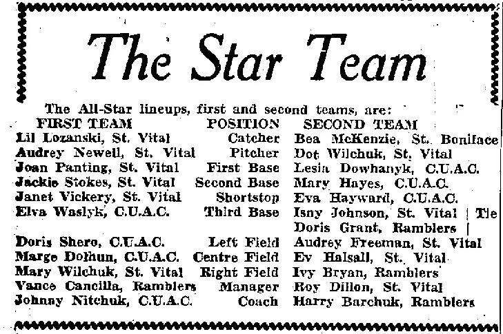 When people speak about the glory days of women's softball in Winnipeg when games were played in front of crowds in the thousands, Bea McKenzie is one name usually mentioned. McKenzie won a Manitoba Intermediate Championship with St. Vital Rovers in 1930 and several senior championships with St. Boniface Athletics during that decade and the 1940s. A perennial all-star at catcher and often described as the "backbone" of the Athletics, McKenzie continued to play until 1952. In 1951 when she played several positions, a Winnipeg Free Press reporter wrote, "the ageless Bea would be the logical selection as the best all round player in the league."